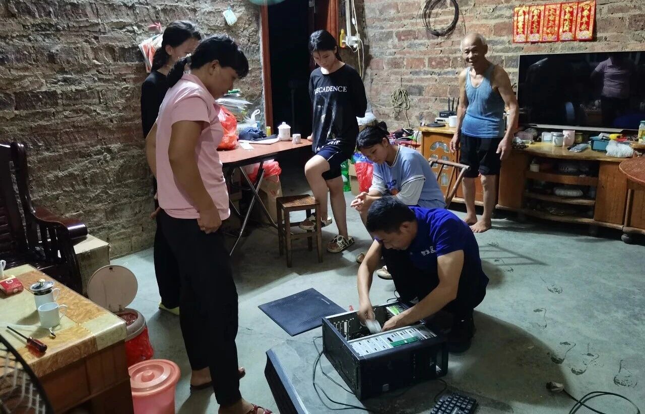 图 黄欢喜(右一)帮助困难户查修电脑主机