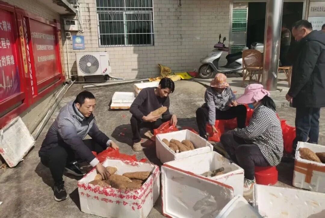图 黄欢喜(左一)帮助村民将葛根分包销售到深圳