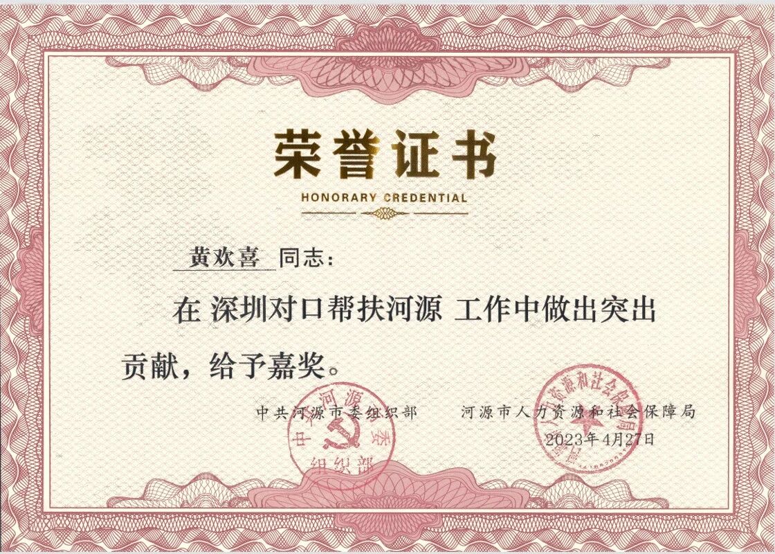 2023年,黄欢喜获得河源市委组织部和河源市人力资源和社会保障局联名颁发的“在深圳对口帮扶河源工作中突出贡献的嘉奖”;