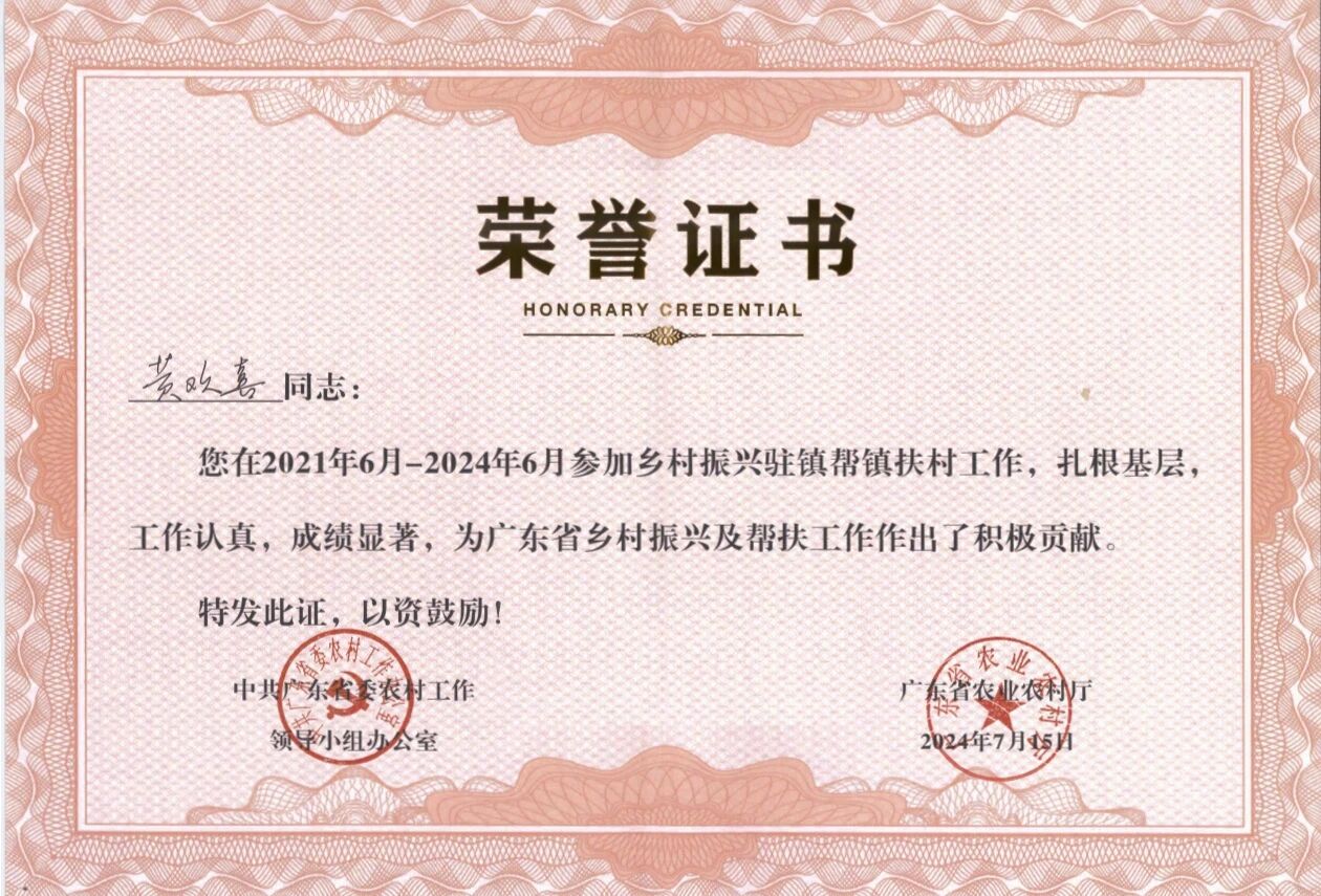 又在2024年获得广东省委农村工作领导办公室和广东省农业农村厅颁发的“广东省乡村振兴帮扶积极贡献奖"。