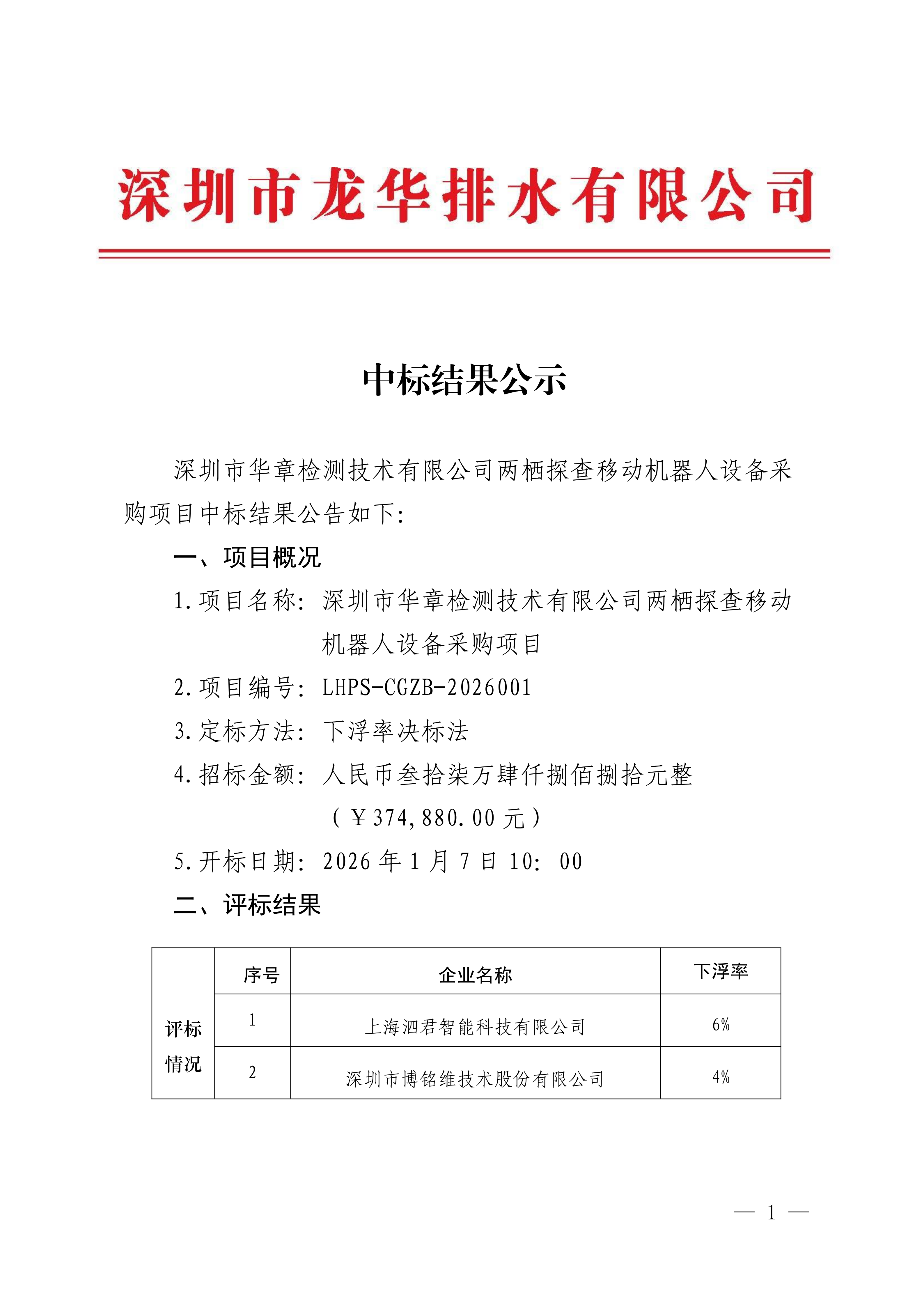 中标结果公示(深圳市华章检测技术有限公司两栖探查移动机器人设备采购项目)